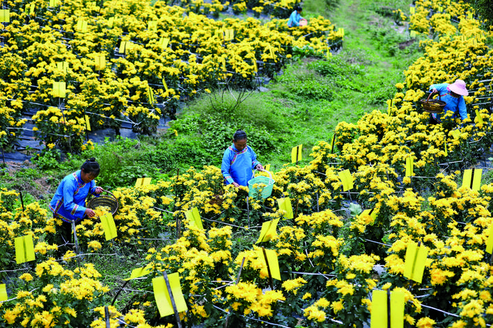 近期,錦屏縣平略鎮平鰲村種植的金絲皇菊進入收獲期,村民搶抓農時采摘、分選、烘烤,供應各地市場。